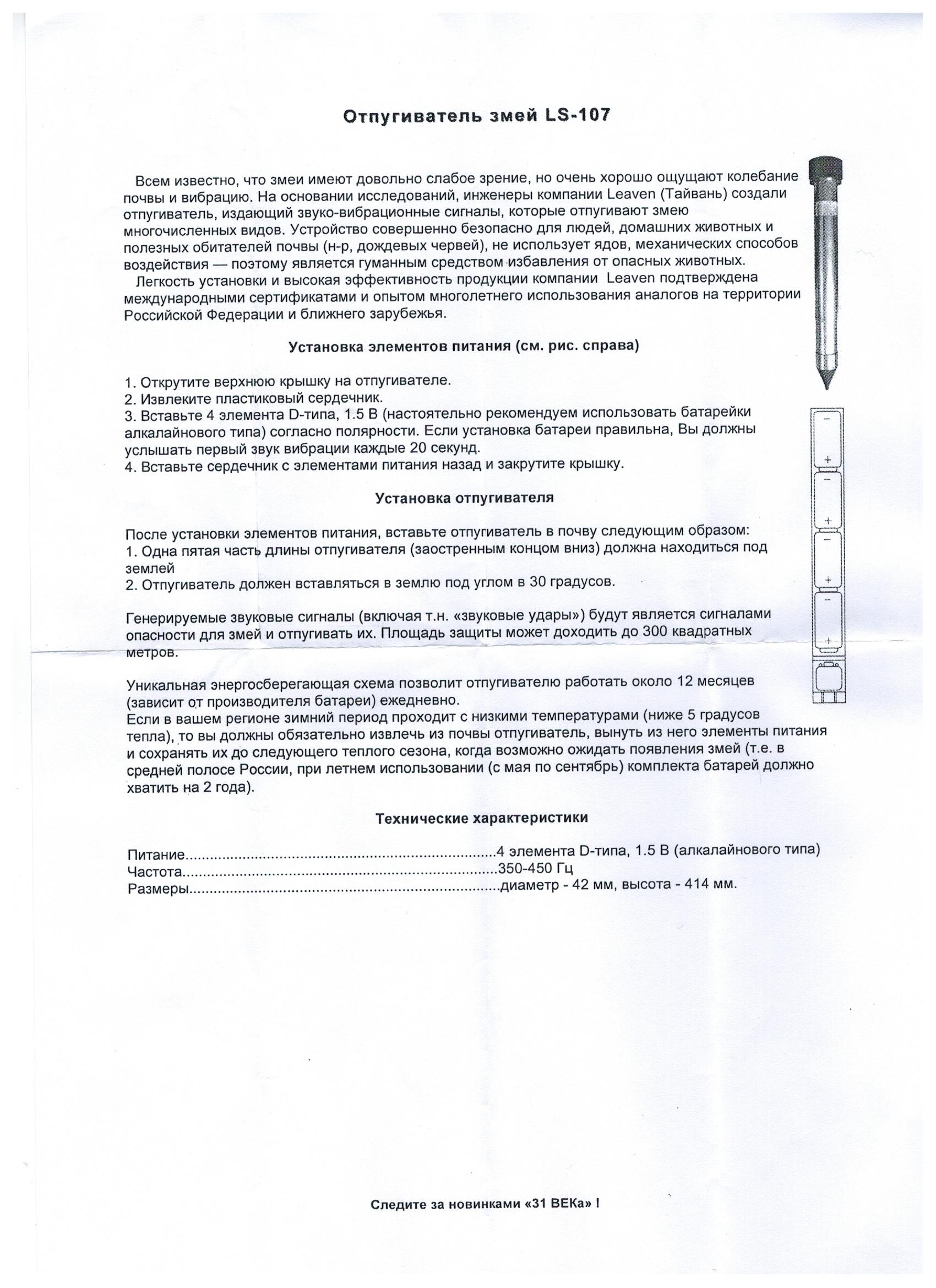 Купила отпугиватель змей «Эко снайпер LS107»-прекрасно справился на даче со змеями. Раньше постоянно встречались с присутствием ужей на территории дачного участка. С приобретением отпугивателя жизнь на даче изменилась. Можно не боясь свободно в открытой обуви ходить по улице, даже ночью. Однако теперь появились мышки в доме, но это ничто по сравнению с ползающими гадами по грядкам. Спасибо большое за такие изобретения и тем кто их поставляет.Работает безукоризненно, даже во время дождя.